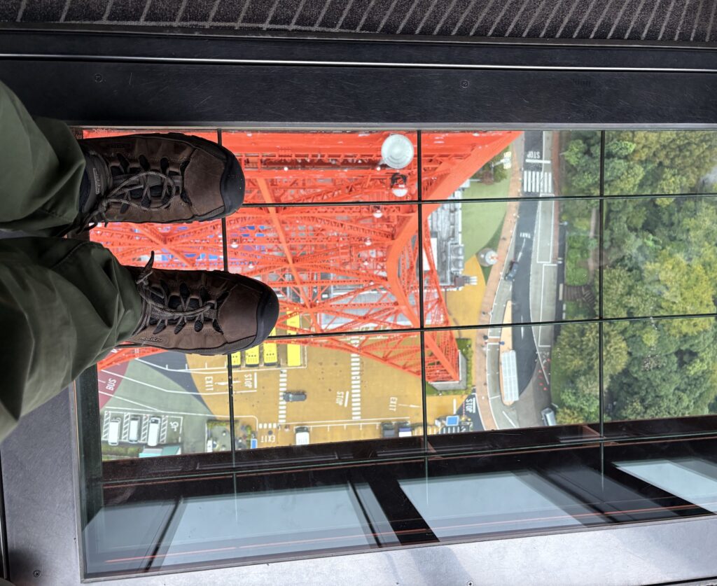 A few weeks later we arrived back at the station ahead of our last night in Japan, stopping at a hotel near the Hamamatsucho station. The weather was drab and damp but we went off to one of the city’s tackiest attractions – the Tokyo Tower – to pass the last few daylight hours. Opened in the 1950s as a copy of the Eiffel Tower and as touristy as it’s possible to be, it had good views from the main deck but cloud swirled around further up so there was no point going any higher. Everywhere we turned were souvenir shops filled with plastic tat and fridge magnets, along with a range of other attractions designed to relieve visitors of their yen. It was colourful and ludicrous all at the same time. Later we went out in Hamamatsucho for our last night of food and drink before our flight home from Haneda the next morning.
