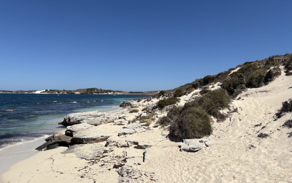 It’s a beautiful and striking place, an island of scrub that somehow grows on the thin soils and fine white sands. Some trees, occasionally bent into curious shapes by the wind and home to giant spiders’ webs, have colonised a efw areas. The dazzling sands lie on a bed of limestone that breaks out at the coast in fascinating rock formations, pitted and eroded.