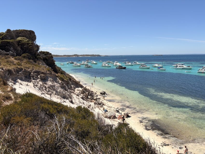 We took the morning premium boat service from the Barrack Street Jetty on Elizabeth Quay, complete with free food and drink. The catamaran took us slowly down the Swan River on a beautifully sunny day, past swanky homes and marinas, parks dominated by large gums and the industrial might of the city port, before emerging on to the Indian Ocean. A ninety minute journey later we were docking at our destination.