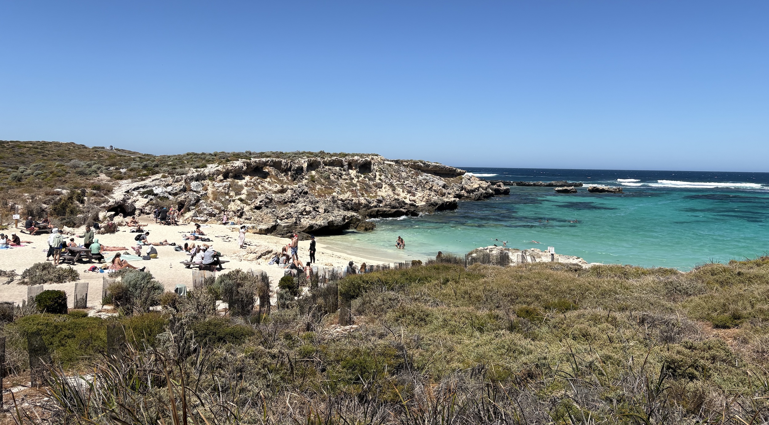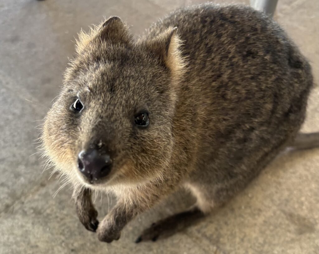 Most tourists are drawn to Rottnest by the landscape, the sandy beaches and the turquoise seas. It’s all very photogenic and the waters crystal clear – we even went for a paddle at popular Little Salmon Bay. Later we skirted round the Wadjemup lighthouse, and past the various salty lakes that make up much of the interior. We dropped down to Geordie Bay, lined by a small number of holiday homes, and stopped for a spot of lunch and a reviving beer, before completing our circuit back at Thomson Bay. Here, quokkas nosed around for something to eat while tourists took endless photos. Clearly, for some, the animals are the main draw.